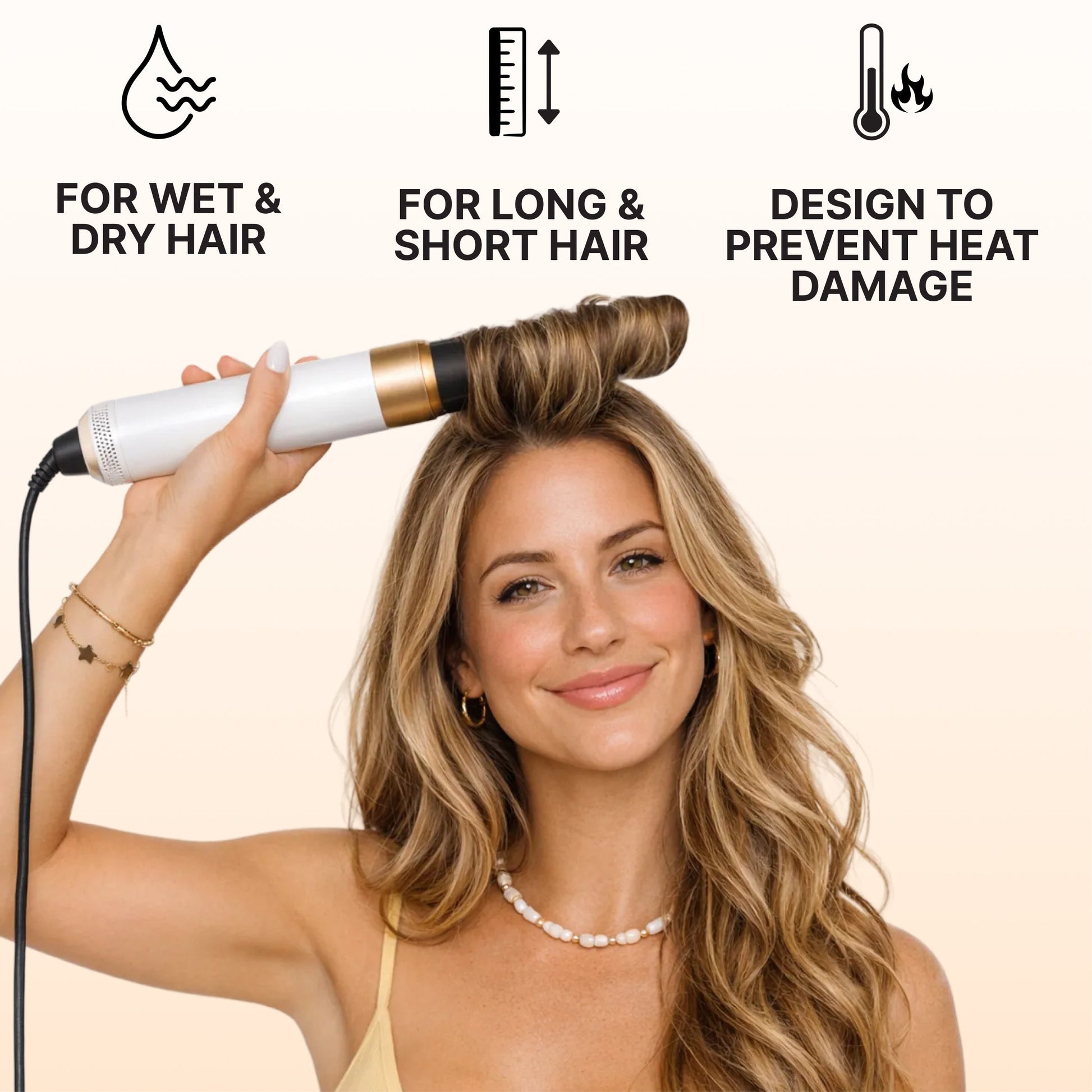 The 5 in 1 MultiStyler allows you to dry, curl, smooth, straighten, and volumize your hair using one tool and interchangeable attachments. It replaces multiple styling tools, saving time and space while delivering salon-style results at home.